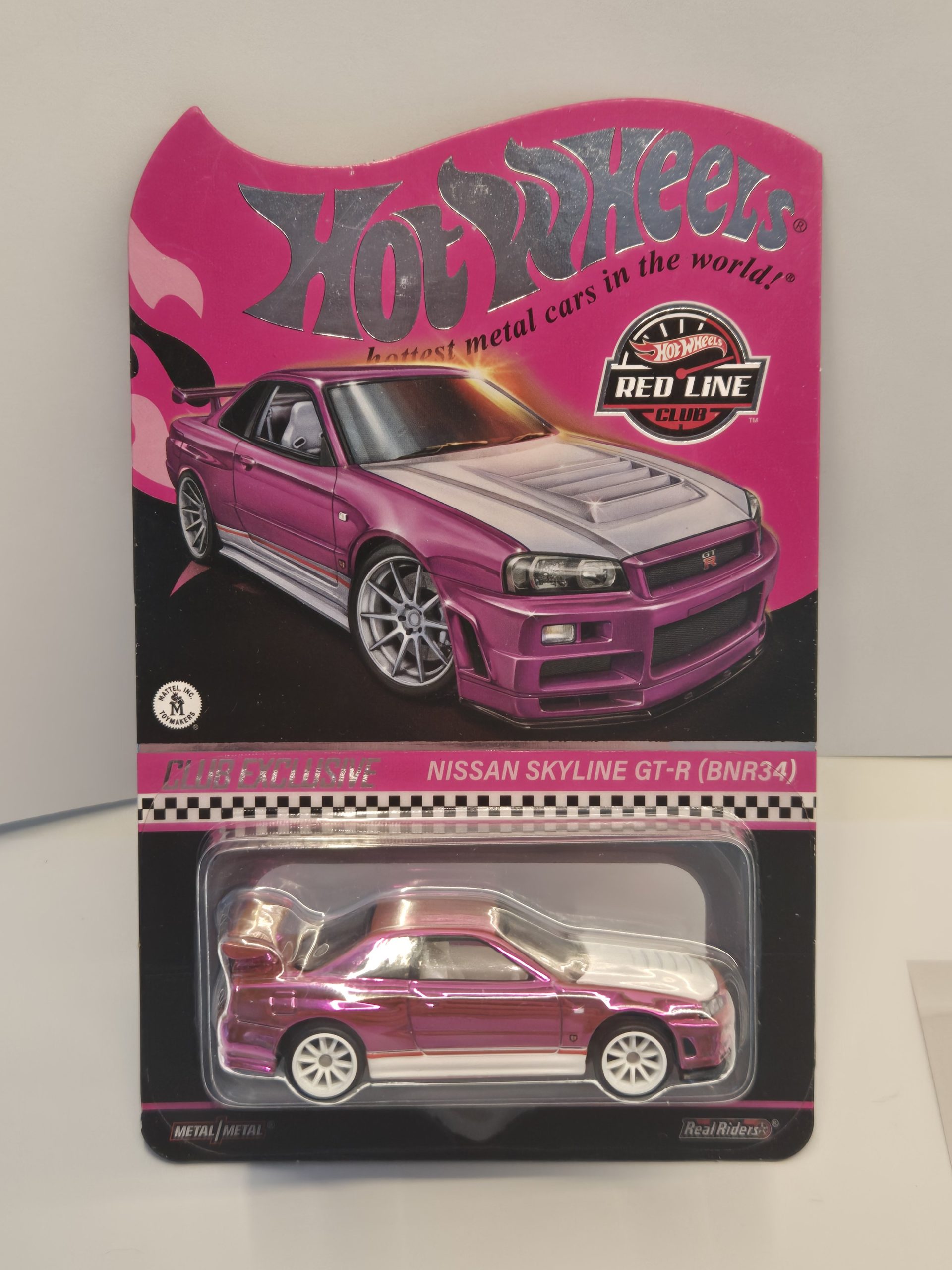 The real Nissan Skyline GT-R (BNR34) is legendary for its power and handling. Our Pink Edition of this hot casting features an opening hood, painted engine details, white accents, and Real Riders 10-spoke wheels.